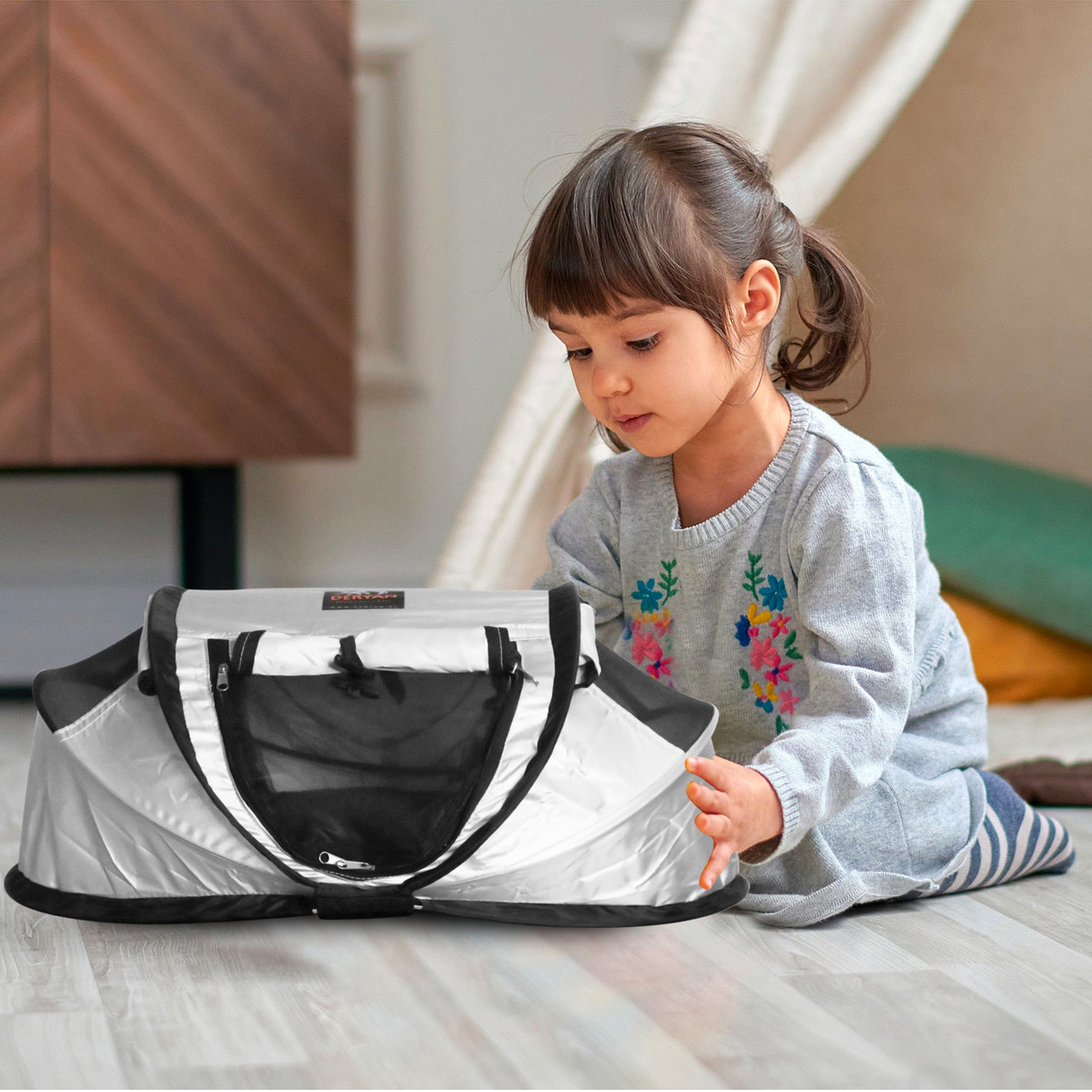 Deryan Dank seines cleveren Pop-up-Designs ist das TravelCot Mini Puppenzelt in Sekundenschnelle aufgebaut und einsatzbereit. Das macht es ideal für spontane Spielstunden, sowohl drinnen als auch draußen. Wenn die Spielzeit vorbei ist, lässt sich das Zelt leicht zusammenfalten und platzsparend verstauen.